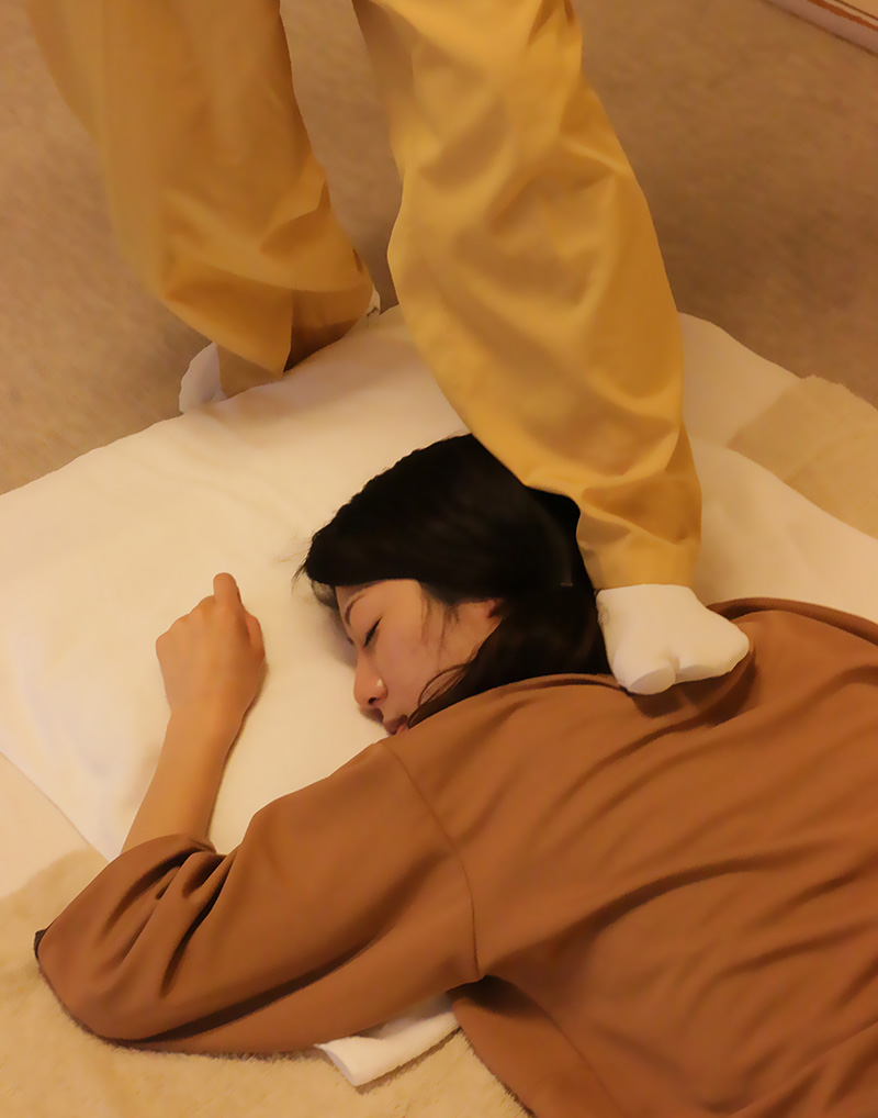 足を使って体全体を丁寧にほぐしていきます。筋肉のコリを解消し、血流やリンパの流れを促すために、足の力を適度にコントロールしながら施術します。